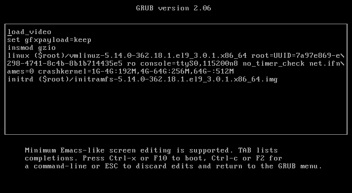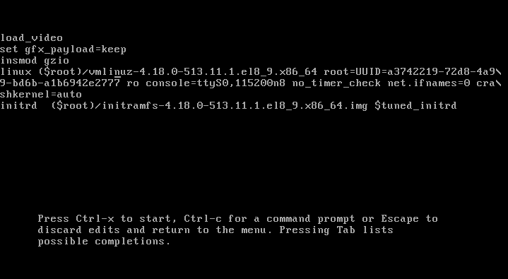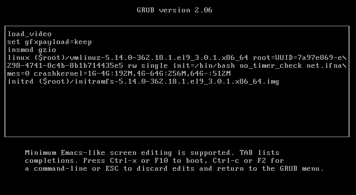 Rocky와 많이 다르지만 침착하게 console 부분을 찾아 ro를 rw로, console을 삭제하고 init=/bin/bash를 추가해줍니다.