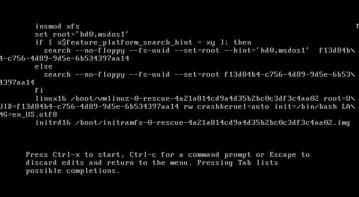 이렇게 커널 편집을 통해 /bin/bash로 시작이 되도록 설정하였습니다. 이제 root의 비밀번호를 수정해보겠습니다.