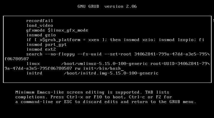 해당 부분을 rw init=/bin/bash로 수정해줍니다.