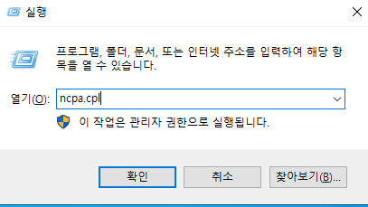 실행 프로그램을 열고 ncpa.cpl을 입력합니다.