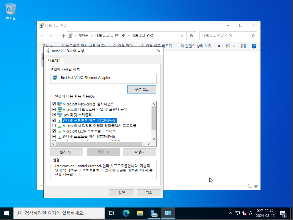 인터넷 프로토콜 버전 4(TCP/IPv4)를 선택하여 네트워크 설정을 해줍니다.
