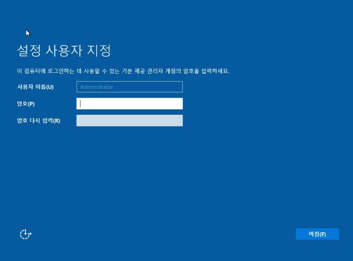 이제 재부팅이 완려되면 Administrator의 암호를 설정할 수 있습니다.